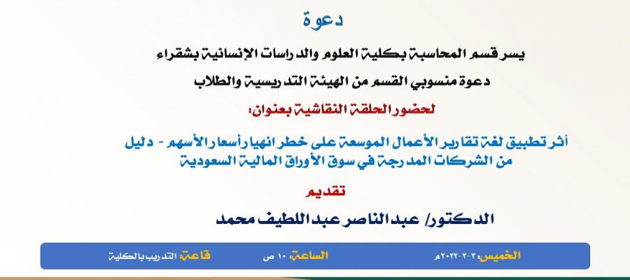 "أثر تطبيق لغة تقارير الأعمال الموسعة على خطر انهيار أسعار الأسهم - دليل من الشركات المدرجة في سوق الأوراق المالية السعودية " – حلقه نقاش علمية بقسم المحاسبة