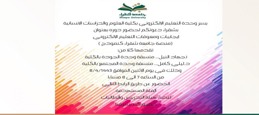 ورشه عمل " إيجابيات ومعوقات التعليم الإلكتروني" (منصة جامعة شقراء كنموذج)