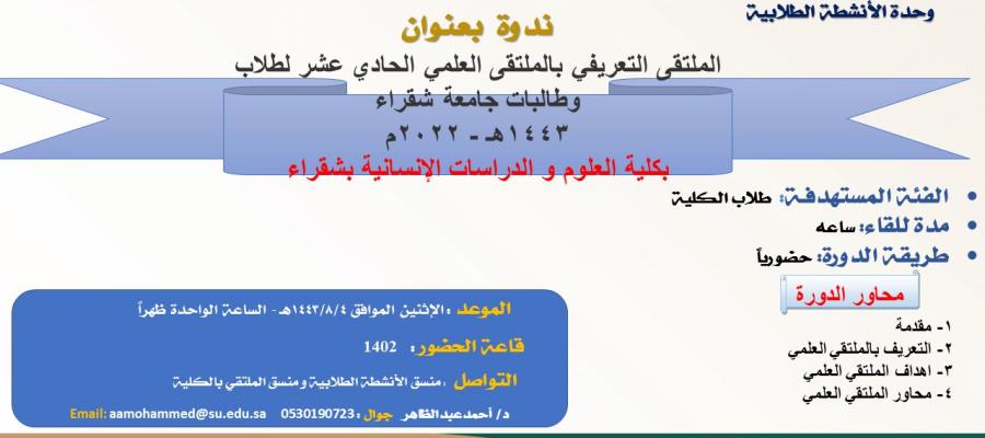 الملتقى التعريفي بالملتقى العلمي الحادي عشر لطلاب وطالبات جامعة شقراء 1443هـ - 2022م بكلية العلوم و الدراسات الإنسانية بشقراء