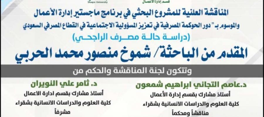 المناقشة العلنية للمشروع البحثي ببرنامج الماجستير بقسم إدارة الاعمال للطالبة/ شموخ منصور محمد الحربي