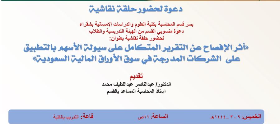 «أثر الإفصاح عن التقرير المتكامل على سيولة الأسهم بالتطبيق على الشركات المدرجة في سوق الأوراق المالية السعودية» حلقة نقاش بقسم المحاسبة
