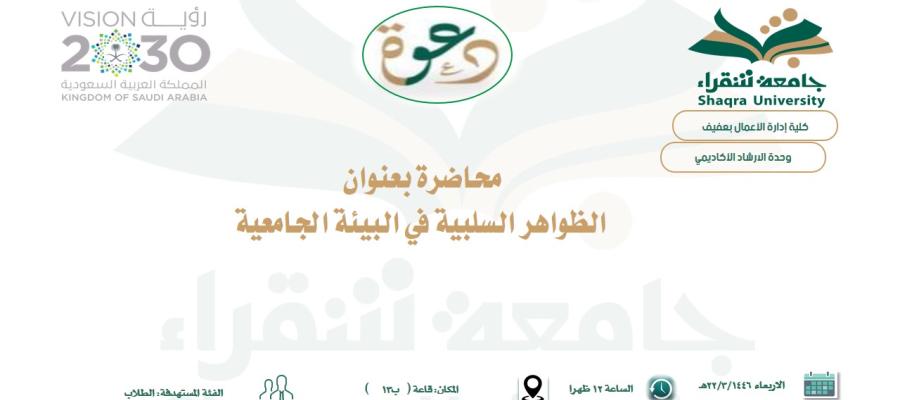 دعوة طلاب كلية إدارة الأعمال بعفيف لحضور محاضرة بعنوان: الظواهر السلبية فى البيئة الجامعية يوم الإربعاء الموافق 22/3/1446 هـ الساعة 12 ظهرا في قاعة ب 13 بمبنى الكلية