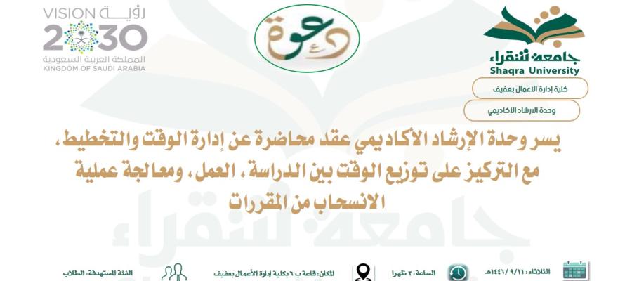لحضور محاضرة عن إدارة الوقت والتخطيط، مع التركيز على توزيع الوقت بين الدراسة، العمل، ومعالجة عملية الانسحاب من المقررات