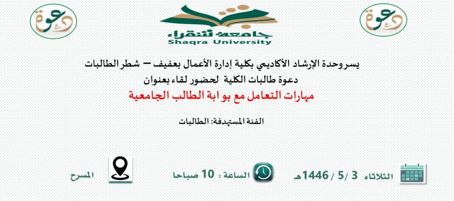 يوم: الثلاثاء الموافق: 3/5/1446 ه الساعة: 10 صباحا في مسرح الكلية