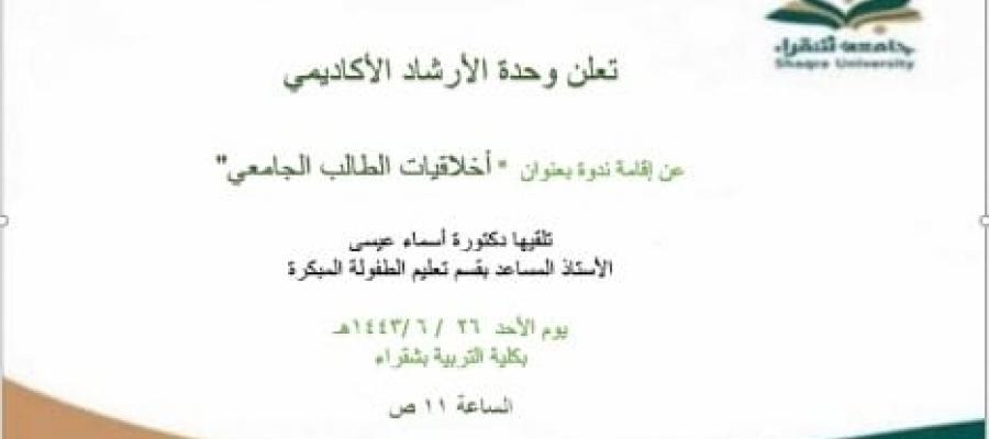 تعلن كلية التربية بشقراء عن إقامة ندوة بعنوان ( أخلاقيات الطالب الجامعي ) .