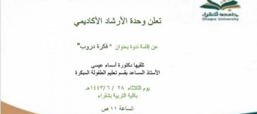 تعلن وحدة الإرشاد الأكاديمي بكلية التربية بشقراء عن إقامة ندوة بعنوان (فكرة دروب ) .