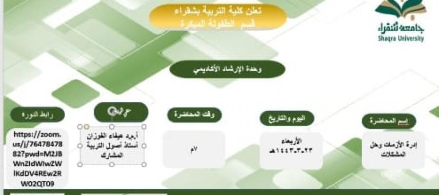 تعلن وحدة الإرشاد الأكاديمي بكلية التربية بشقراء عن إقامة محاضرة بعنوان (إدارة الأزمات وحل المشكلات ) .