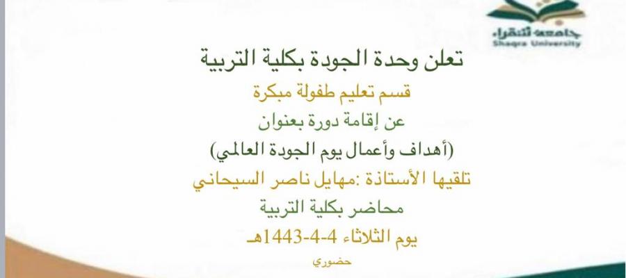 تعلن وحدة الجودة بكلية التربية عن إقامة دورة بعنوان (أهداف وأعمال يوم الجودة العالمي ).