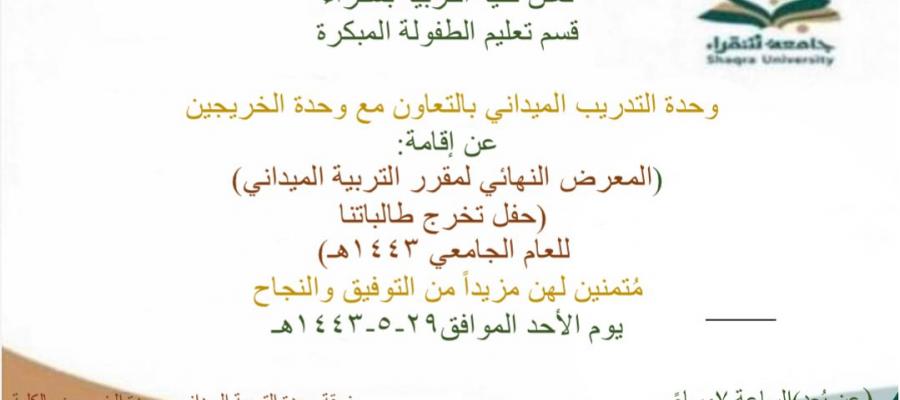 تعلن كلية التربية بشقراء عن إقامة ( المعرض النهائي لمقرر التربية الميدانية ) ، (حفل تخرج طالباتنا للعام الجامعي 1443هـ) .