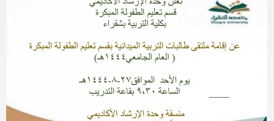تعلن وحدة الإرشاد الأكاديمي بكلية التربية بشقراء عن إقامة ملتقى طالبات التربية الميدانية بقسم تعليم الطفولة المبكرة للعام الجامعي 1444هـ.