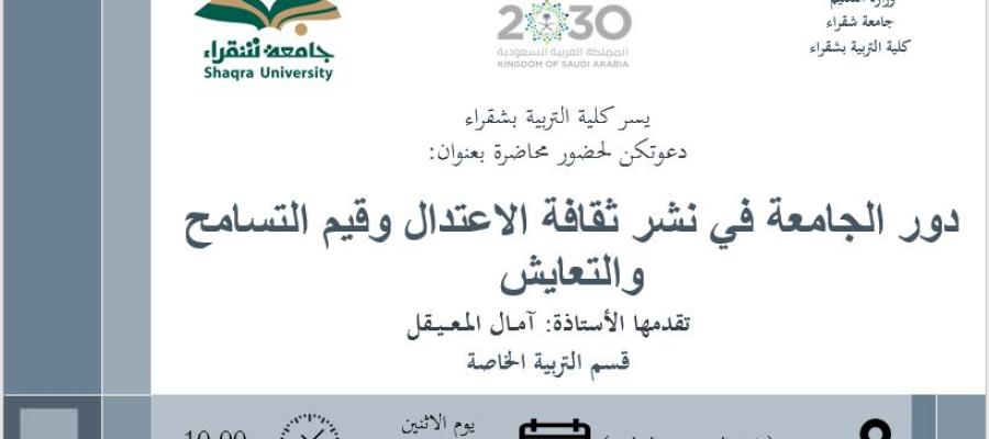 كلية التربية بشقراء تدعوكم لحضور محاضرة بعنوان ( دور الجامعة في نشر ثقافة الإعتدال وقيم التسامح والتعايش).