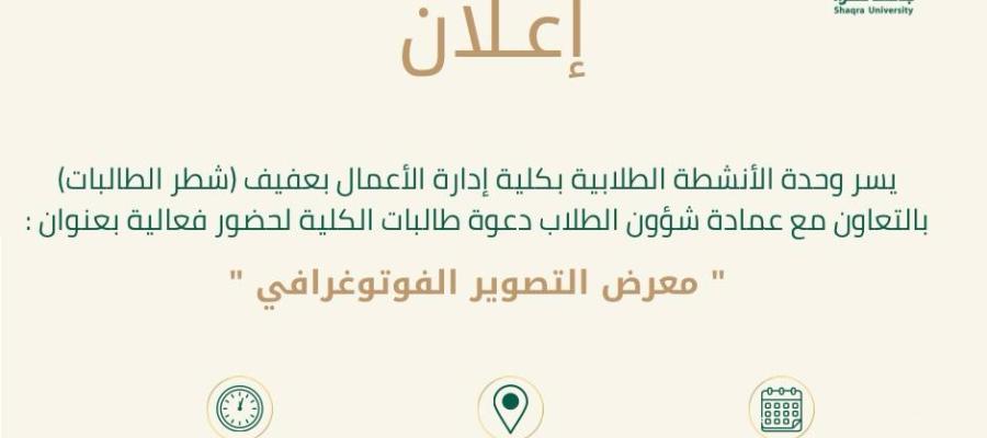 يسر وحدة الأنشطة الطلابية بكلية إدارة الأعمال بعفيف – شطر الطالبات بالتعاون مع عمادة شؤون الطلاب دعوة طالبات الكلية لحضور فعالية بعنوان: