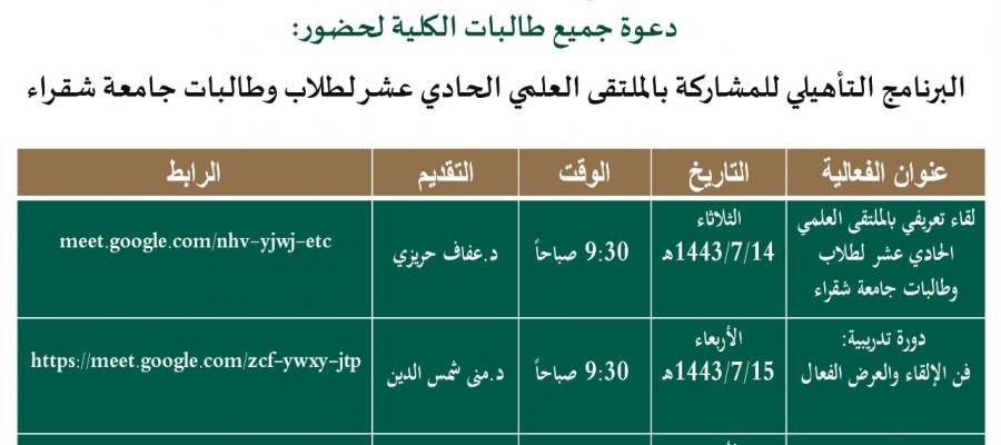البرنامج التأهيلي للمشاركة بالملتقى العلمي الحادي عشر لطلاب وطالبات جامعة شقراء
