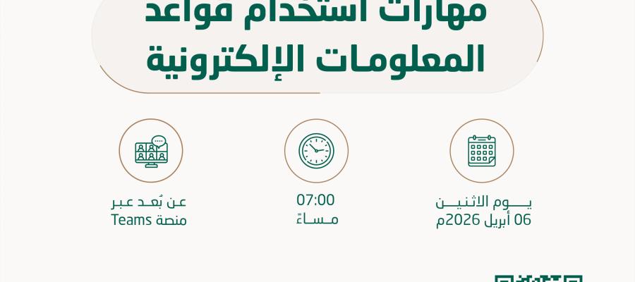 تعلن إدارة مصادر التعلم بوكالة الجامعة للدراسات العليا والبحث العلمي ، وبالتعاون مع كلية التربية بالدوادمي عن إقامة دورة تدريبية بعنوان (مهارات استخدام قواعد المعلومات الالكترونية)