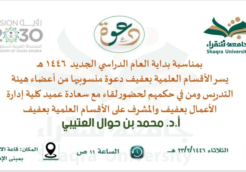 الثلاثاء 3 سبتمبر اللقاء الأول مع الطاقم الاداري من منسوبي كلية إدارة الأعمال والأقسام العلمية بعفيف بمناسبة بداية العام الدراسي 1446هـ