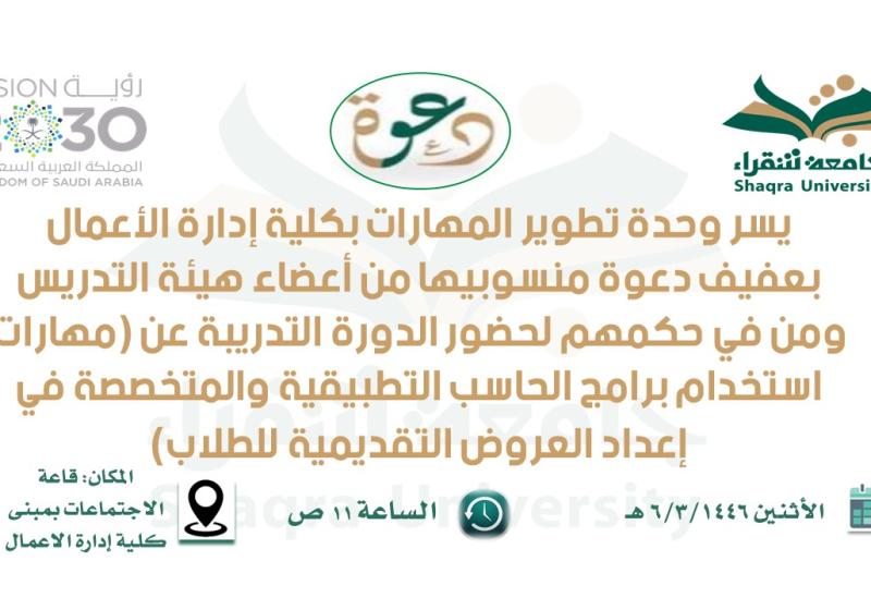 الخميس 5 سبتمبر الدورة التدريبة عن (مهارات استخدام برامج الحاسب التطبيقية والمتخصصة في إعداد العروض التقديمية للطلاب)