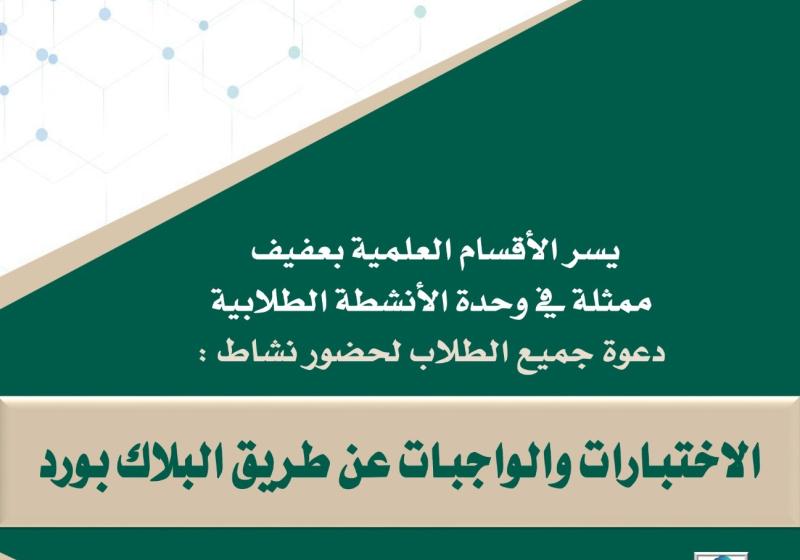 الاثنين 16 سبتمبر الاختبارات والواجبات عن طريق البلاكبورد السبت 14 سبتمبر أهمية الارشاد الاكاديمي للطلاب الخميس 12 سبتمبر ورشة عمل حول مهارات استخدام المرشدين الأكاديميين لنظام الريجستر وخدمة تواصل الأحد 8 سبتمبر محاضرة بعنوان التكيف الاجتماعي لطلبة المستوى الأول بالحياة الجامعية الخميس 5 سبتمبر الدورة التدريبة عن (مهارات استخدام برامج الحاسب التطبيقية والمتخصصة في إعداد العروض التقديمية للطلاب) الثلاثاء 3 سبتمبر اللقاء الأول مع الطاقم الاداري من منسوبي كلية إدارة الأعمال والأقسام العلمية بعفيف بمناسبة بداية العام الدراسي 1446هـ الاثنين 2 سبتمبر متابعة الإشكاليات(نفسية-تعليمية-اجتماعية-صحية-مادية) التي يواجهها الطلاب المتعثرون أكاديميا الاثنين 2 سبتمبر التعريف بمرافق الخدمات الجامعية المقدمة عن بعد والعمليات الأكاديمية الالكترونية المتوفرة على بوابة جامعة شقراء الأحد 1 سبتمبر الدورة التدريبة عن (الواجهة الجديدة لمنصة جامعة شقراء) (Blackboard Ultra) الأحد 1 سبتمبر فن الاستذكار للمفردات باللغة الانجليزية السبت 31 أغسطس استعراض و مناقشة الخطة التشغيلية للكلية التطبيقية الثلاثاء 27 أغسطس لقاء بمناسبة بداية العام الدراسي 1446 هـ مشاهدة المزيد