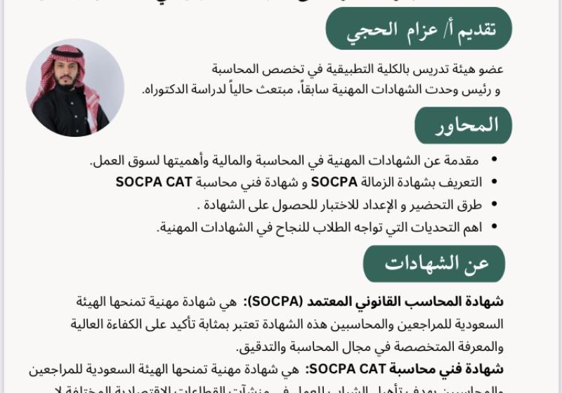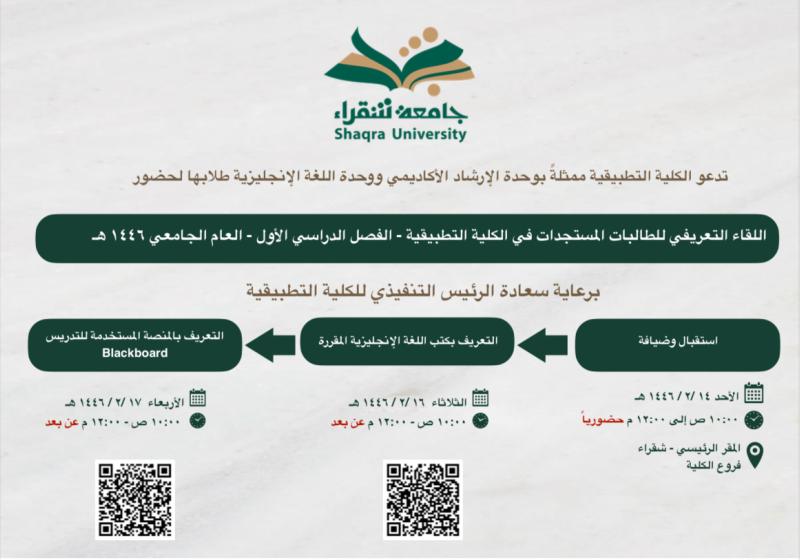 الثلاثاء 27 أغسطس مهارات الشخصية القيادية الأحد 25 أغسطس بمناسبة بداية العام الدراسي الجديد 1446هـ يسر كلية إدارة الأعمال بعفيف دعوة منسوبيها من أعضاء هيئة التدريس ومن في حكمهم لحضور لقاء مع سعادة عميد الكلية أ.د. محمد بن حوال العتيبي السبت 24 أغسطس حفل استقبال الطلاب الجدد للعام الجامعي ١٤٤٦هـ بكلية إدارة الأعمال بعفيف الأربعاء 21 أغسطس اللقاء التعريفي للطلبة المستجدين لعام ١٤٤٦هـ في الكلية التطبيقية بشقراء الخميس 15 أغسطس دعوة "طالبات" (اللقاء التعريفي للطالبات المستجدات في الكلية التطبيقية ) الخميس 15 أغسطس دعوة "طلاب" (اللقاء التعريفي للطلاب المستجدين في الكلية التطبيقية) الاثنين 20 مايو لقاء بعنوان (الاستعداد المبكر للحصول على الشهادات المالية في المحاسبة والمالية) الأربعاء 15 مايو إقامة ورشة عمل بعنوان (إدارة التغيير) الأربعاء 15 مايو الكلية التطبيقية تنظم اللقاء التعريفي بشهادة أخصائي ضريبة القيمة المضافة الثلاثاء 14 مايو الكلية التطبيقية بجامعة شقراء تطلق مبادرة "طريقك نحو المهنية" لطلاب الثانوية الثلاثاء 14 مايو الكلية التطبيقية بجامعة شقراء تطلق مبادرة "طريقك نحو المهنية" لطلاب الثانوية الخميس 9 مايو تنفيذ زيارة تعريفية بالكلية لمدرسة الملك عبدالعزيز مشاهدة المزيد