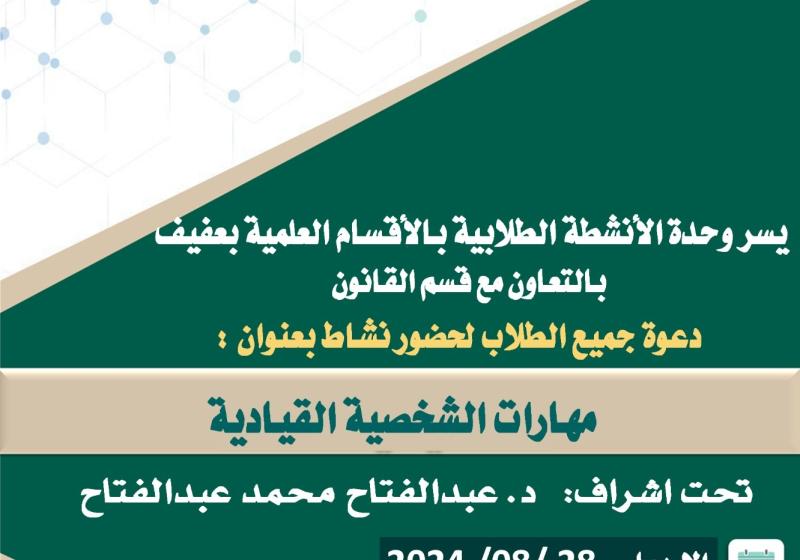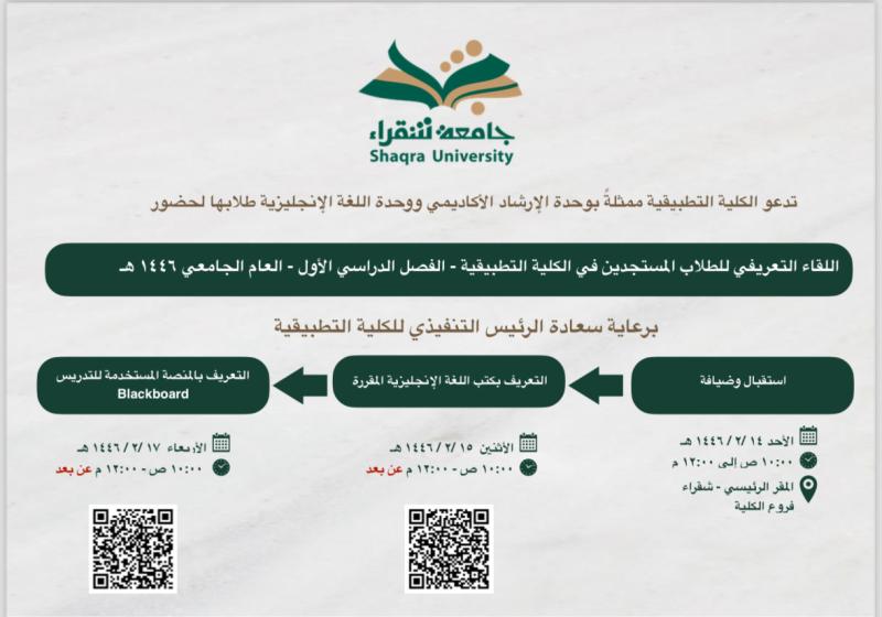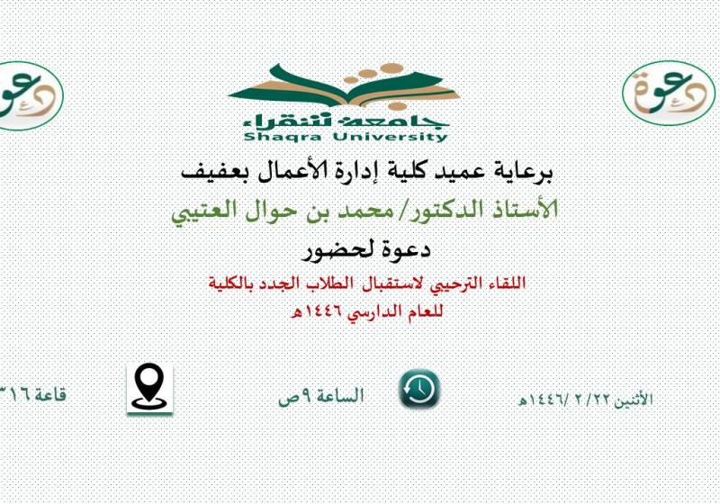الأحد 25 أغسطس بمناسبة بداية العام الدراسي الجديد 1446هـ يسر كلية إدارة الأعمال بعفيف دعوة منسوبيها من أعضاء هيئة التدريس ومن في حكمهم لحضور لقاء مع سعادة عميد الكلية أ.د. محمد بن حوال العتيبي