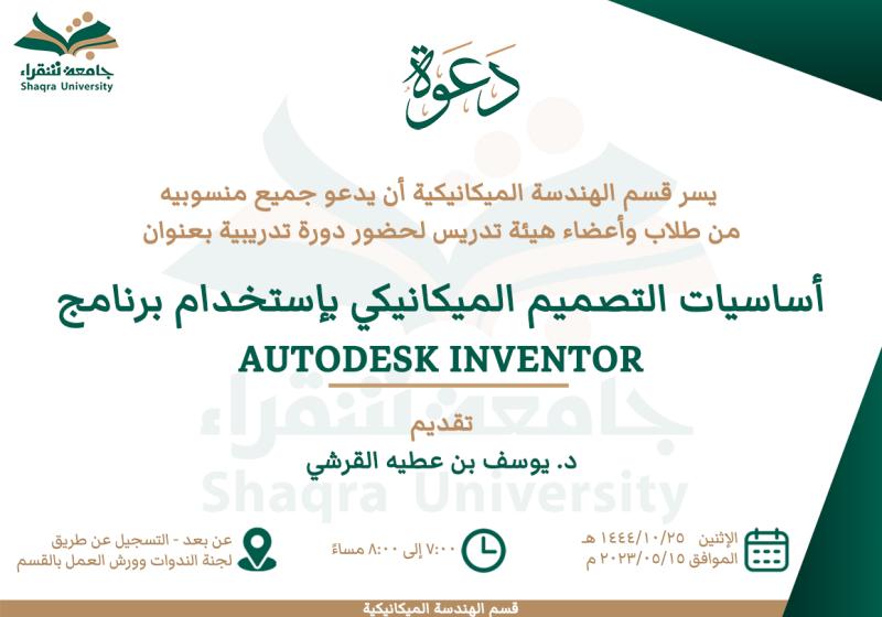 الاثنين 25 سبتمبر ظاهرة التنمر في المجتمع: أنواعها، أسبابها وطرق علاجها الاثنين 18 سبتمبر دعوة لحضور" اليوم العالمي للسلام" الأحد 17 سبتمبر اليوم الدولي للقانون السبت 9 سبتمبر أصبوحة شعرية الاثنين 21 أغسطس لقاء بمناسبة بداية العام الدراسي 1445 هـ الاثنين 21 أغسطس اللقاء الترحيبى لسعادة عميد كلية إدارة الأعمال بعفيف مع أعضاء هيئة التدريس الاثنين 29 مايو "التميز و الرضا الوظيفي" محاضرة للكادر الإداري ضمن مبادرة تطوير الكادر الإداري بالكلية الثلاثاء 23 مايو " التنوع البيئي" بشطر الطالبات الاثنين 22 مايو " الإبداع الإداري و التميز في بيئة العمل" محاضرة بشطر الطالبات ضمن مبادرة تأهيل الكادر الإداري بالكلية السبت 13 مايو دورة تدريبية بعنوان أساسيات التصميم الميكانيكي بإستخدام برنامج Autodesk Inventor الثلاثاء 9 مايو يسر قسم الهندسة الميكانيكية دعوة جميع منسوبيه لحضور الملتقى الفصلي لطلاب القسم الثلاثاء 9 مايو حل مشكلة السبيلنق "Spelling" مشاهدة المزيد