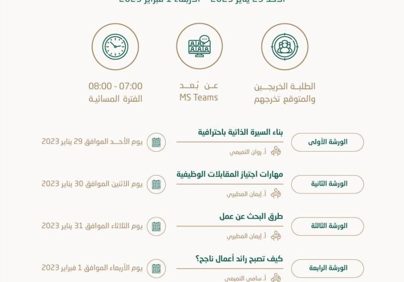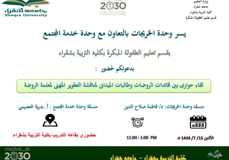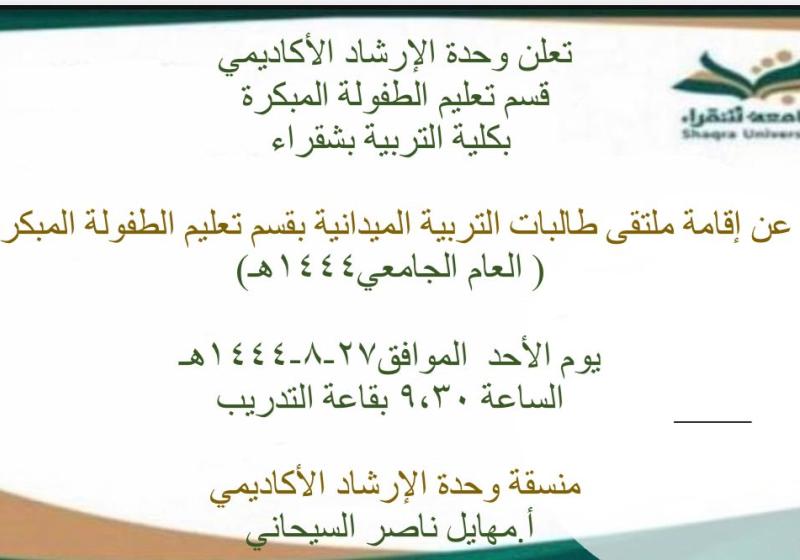 الأحد 19 مارس تعلن وحدة الإرشاد الأكاديمي بكلية التربية بشقراء عن إقامة ملتقى طالبات التربية الميدانية بقسم تعليم الطفولة المبكرة للعام الجامعي 1444هـ.