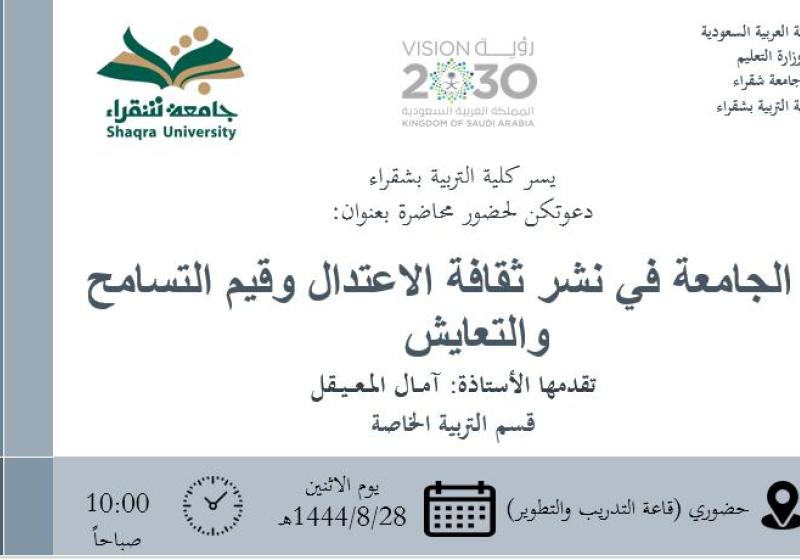 الاثنين 20 مارس كلية التربية بشقراء تدعوكم لحضور محاضرة بعنوان ( دور الجامعة في نشر ثقافة الإعتدال وقيم التسامح والتعايش).