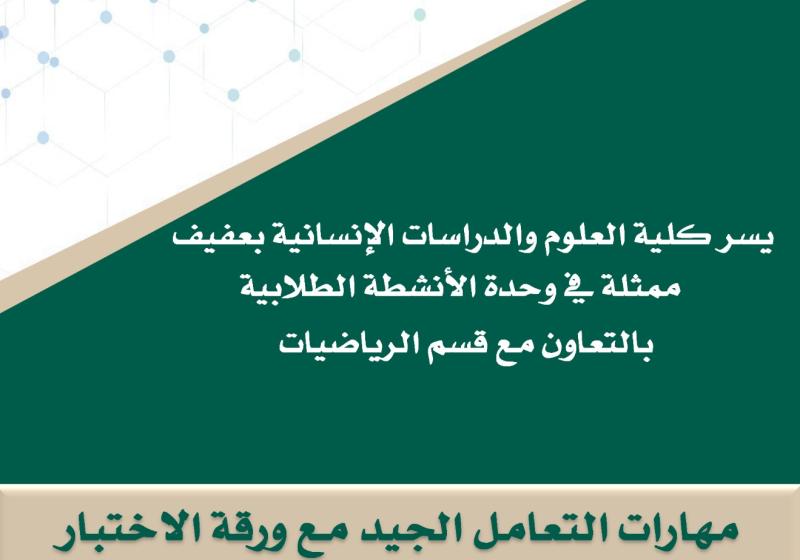 الثلاثاء 9 مايو مهارات التعامل الجيد مع ورقة الإختبار الثلاثاء 2 مايو حلقة نقاشية بقسم المحاسبة بعنوان «دور تكنولوجيا سلسلة الكتل في تحسين جودة نظام الرقابة الداخلية في الشركات المدرجة في سوق الأوراق المالية السعودي» الأربعاء 26 أبريل محاضرةبعنوان: حماية الملكية الفكرية/ بكلية إدارة الأعمال بعفيف الثلاثاء 11 أبريل Student Activities 443 الثلاثاء 4 أبريل محاضرةبعنوان: أساسيات البحث العلمى / بكلية إدارة الأعمال بعفيف(طالبات) الثلاثاء 4 أبريل دورة بعنوان: تأهيل المحاسبين لسوق العمل/ بكلية إدارة الأعمال بعفيف(طالبات) الاثنين 20 مارس كلية التربية بشقراء تدعوكم لحضور محاضرة بعنوان ( دور الجامعة في نشر ثقافة الإعتدال وقيم التسامح والتعايش). الأحد 19 مارس تعلن وحدة الإرشاد الأكاديمي بكلية التربية بشقراء عن إقامة ملتقى طالبات التربية الميدانية بقسم تعليم الطفولة المبكرة للعام الجامعي 1444هـ. الأحد 5 فبراير لقاء حواري بين قائدات الروضات وطالبات الميداني بكلية التربية بشقراء . الأحد 29 يناير المعرض العلمي بالكلية للعام 1444هـ برعاية سعادة رئيس الجامعه الأحد 29 يناير ورشة عمل بعنوان ( أسبوع تهيئة الخريجين والمتوقع تخرجهم لسوق العمل ) . الأحد 29 يناير " انشاء دفتر اليومية باستخدام برنامج الاكسيل" ندوة لوحدة تنمية المهارات مشاهدة المزيد