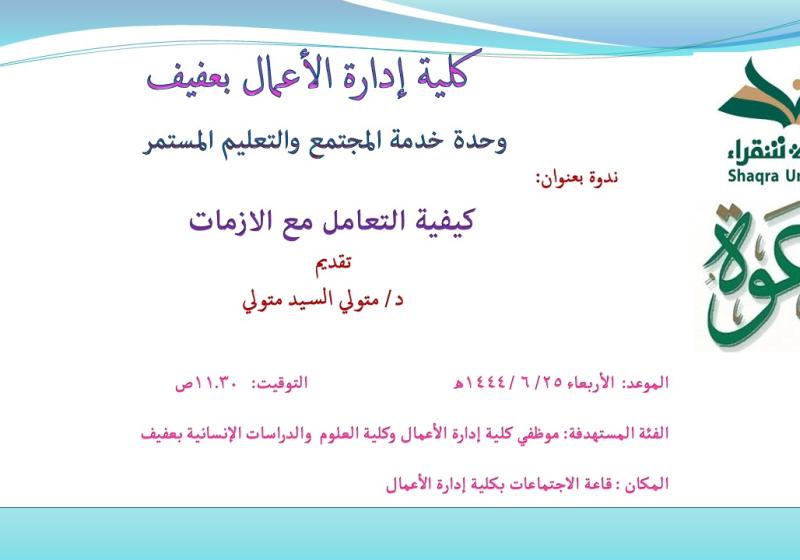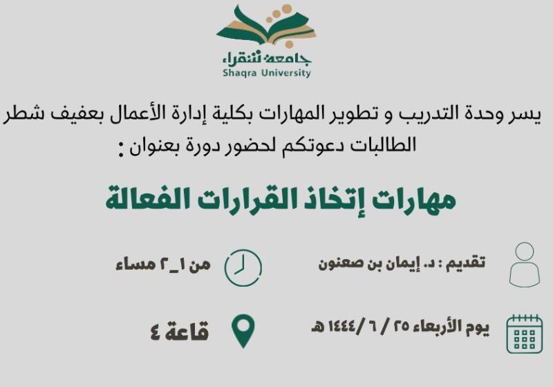 الثلاثاء 17 يناير دورة بعنوان : مهارات اتخاذ القرارات الفعالة/ بكلية إدارة الأعمال بعفيف (شطر الطالبات)