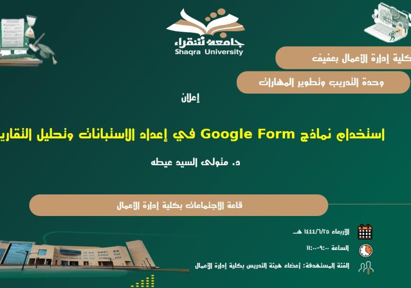 الثلاثاء 10 يناير دورة بعنوان : استخدام نماذج Google Form في اعداد الاستبانات وتحليل التقارير/ بكلية إدارة الأعمال بعفيف