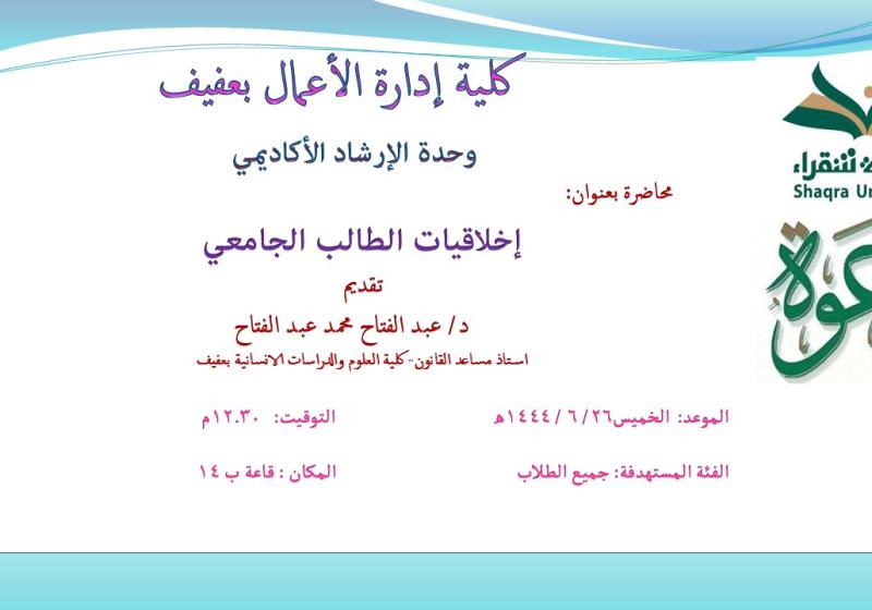 الثلاثاء 17 يناير ندوة بعنوان " كيفية التعامل مع الأزمات " / بكلية إدارة الاعمال بعفيف الثلاثاء 17 يناير محاضرة بعنوان (أخلاقيات الطالب الجامعى) بكلية إدارة الأعمال بعفيف الثلاثاء 17 يناير دورة بعنوان : مهارات اتخاذ القرارات الفعالة/ بكلية إدارة الأعمال بعفيف (شطر الطالبات) الثلاثاء 17 يناير محاضرة بعنوان (مستقبل سوق العمل) بكلية إدارة الأعمال بعفيف/ شطر الطالبات الخميس 12 يناير تنمية مهارات الطلاب المتفوقين الثلاثاء 10 يناير إيجابيات وسلبيات التطور التقني الثلاثاء 10 يناير ورشة عمل حول التعليم الإلكتروني والاختبارات عن بعد/ بكلية إدارة الأعمال بعفيف الثلاثاء 10 يناير دورة بعنوان : استخدام نماذج Google Form في اعداد الاستبانات وتحليل التقارير/ بكلية إدارة الأعمال بعفيف الاثنين 9 يناير كيف نصبح أصدقاء للبيئة الأحد 8 يناير "التلوث الضوضائي" نشاط طلابي بشطر الطالبات الأحد 8 يناير The Noise Terms Phenomenon الأربعاء 4 يناير محاضرة بعنوان العمل التطوعي عند الأطفال . مشاهدة المزيد