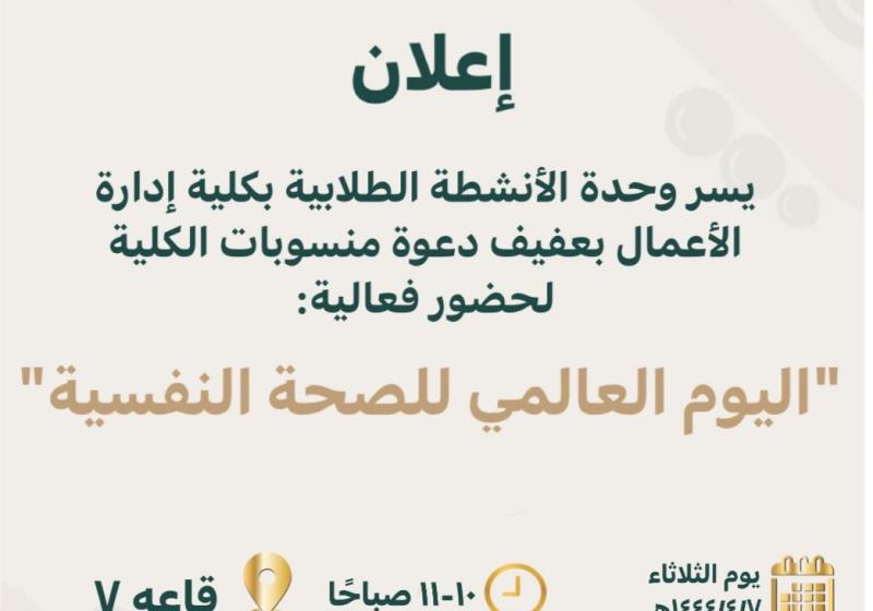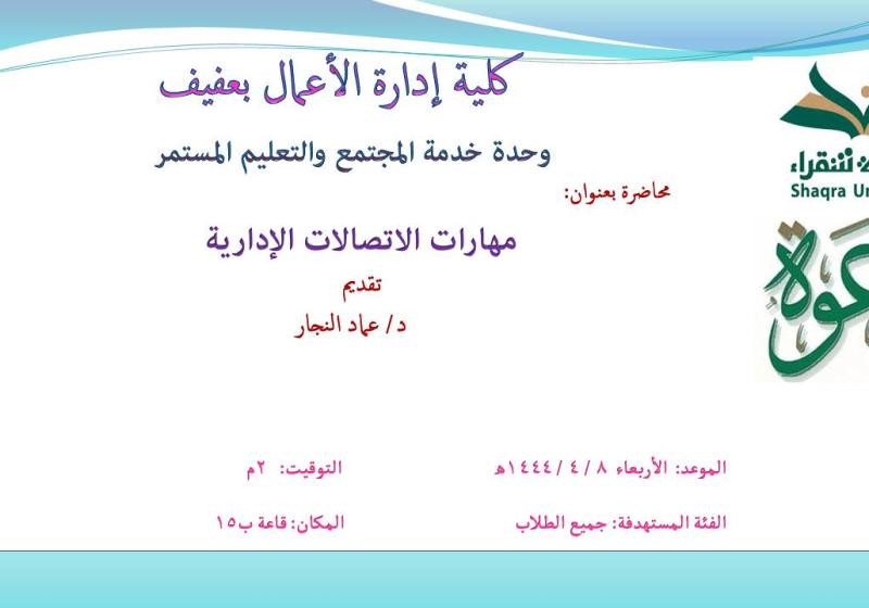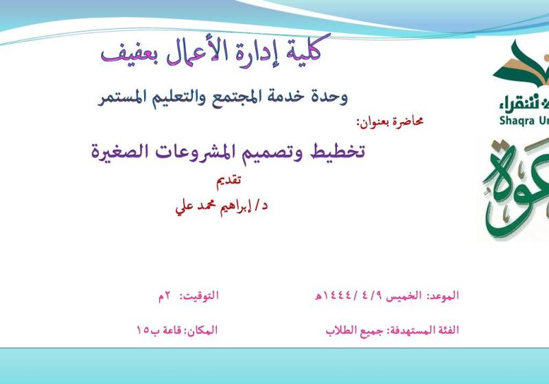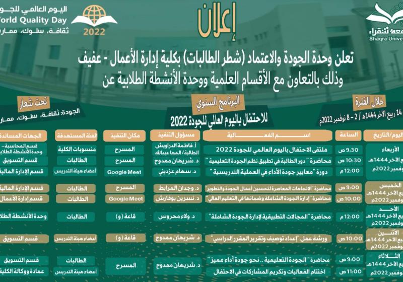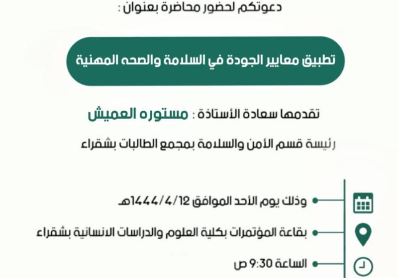 الأحد 6 نوفمبر تعلن وحدة التطوير والجودة بكلية التربية بشقراء عن إقامة محاضرة بعنوان ( تطبيق معايير الجودة في السلامة والصحة المهنية ).