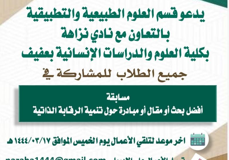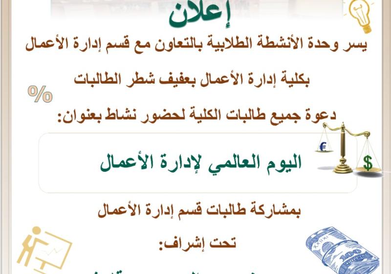 الأحد 25 سبتمبر احتفالية منسوبات كلية إدارة الأعمال بعفيف باليوم الوطنى السعودى 92 الأحد 25 سبتمبر مسابقة أفضل بحث أو مقال أو مبادرة حول تنمية الرقابة الذاتية الأحد 25 سبتمبر الإحتفال باليوم الوطني 92 الأحد 25 سبتمبر احتفالية قسم القانون بمناسبة اليوم العالمي للقانون السبت 24 سبتمبر دعوةلحضور احتفالية الكلية باليوم الوطني ال 92 بشطر الطلاب السبت 24 سبتمبر دعوة لحضور احتفالية شطر الطالبات باليوم الوطني ال 92 الاثنين 12 سبتمبر دعوة للمشاركة في « أصبوحة شعرية و أدبية» لطلاب الكلية الأحد 11 سبتمبر دورة بعنوان: كيفية كتابة التقارير الإدارية/ بكلية إدارة الأعمال بعفيف (طالبات) الخميس 8 سبتمبر محاضرة بعنوان/ المقابلة الشخصية وفن كتابة السيرة الذاتية / بكلية إدارة الأعمال بعفيف (طالبات) الأربعاء 7 سبتمبر نشاط بعنوان " اليوم العالمى لإدارة الأعمال" / بكلية إدارة الأعمال بعفيف (طالبات) الأربعاء 7 سبتمبر فعالية بعنوان بدء مشروع صغير/ بكلية ادارة الاعمال بعفيف (طالبات) الجمعة 26 أغسطس ماهي مميزات برامج الدبلوم الجديدة والمطورة التي أطلقتها الكلية التطبيقية مشاهدة المزيد