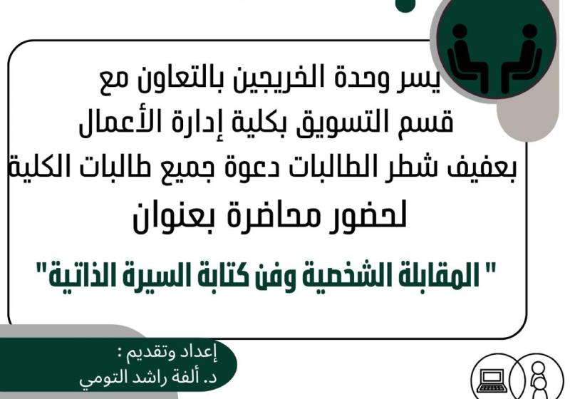 الخميس 8 سبتمبر محاضرة بعنوان/ المقابلة الشخصية وفن كتابة السيرة الذاتية / بكلية إدارة الأعمال بعفيف (طالبات)