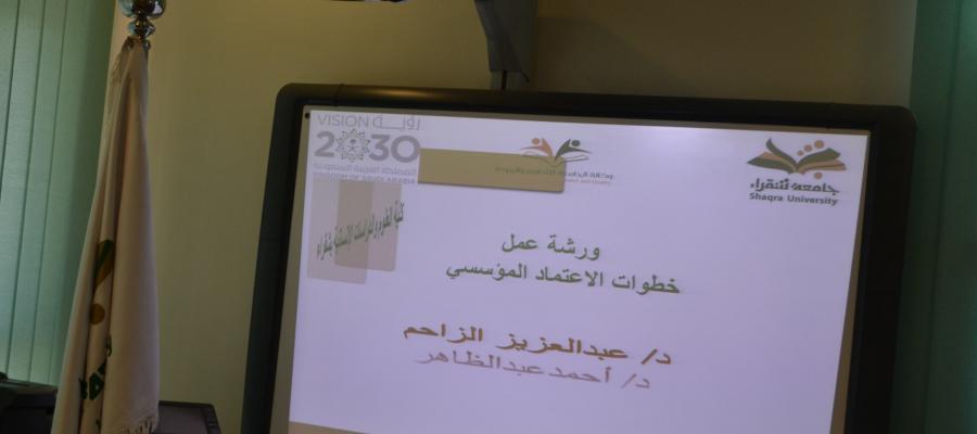 نظمت كلية العلوم والدراسات الإنسانية بشقراء بتاريخ 8/3/1441 ورشه عمل بعنوان "خطوات الاعتماد المؤسسي" قدمها الدكتور/ أحمد عبدالظاهر منسق الكلية للتطوير والجودة بحضور سعادة وكيل كلية العلوم والدراسات الإنسانية بشقراء للتطوير والجودة الدكتور/ عبدالعزيز بن عبدالله الزاحم، وسعادة وكيل كلية العلوم الطبية التطبيقية بشقراء للتطوير والجودة الدكتور/سامر الحربي، وسعادة وكيل كلية التربية للشؤون التعليمية الدكتور/ فهد العليان و منسق السنة التحضيرية للتطوير و الجودة.