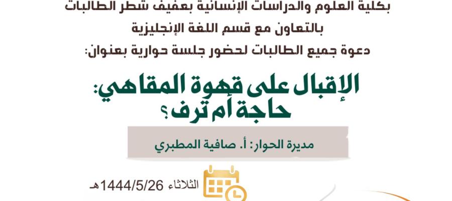 برعاية كريمة من سعادة عميد كلية العلوم والدراسات الإنسانية بعفيف د / محمد بن حوال العتيبي و سعادة وكيلة الكلية الدكتورة وجود حسين مدني قام قسم اللغة الإنجليزية بتفعيل جلسة حوار طلابي بعنوان : الاقبال على قهوة المقاهي: حاجة ام ترف؟