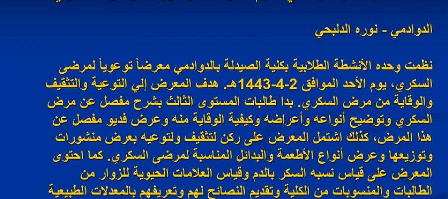 كليه الصيدلة بالدوادمي تقيم معرضاً توعوياً لمرض السكري