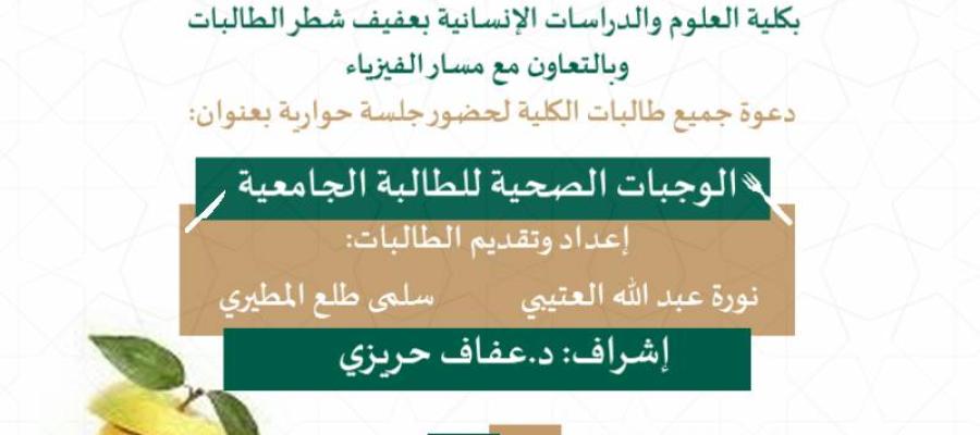 برعاية سعادة عميد كلية العلوم والدراسات الإنسانية بعفيف شطر الطالبات د.محمد بن حوال العتيبي وبتوجيه وإشراف من سعادة وكيلة الكلية د. وجود المدني، قامت وحدة الأمن والسلامة بالتعاون مع قسم العلوم الطبيعية والتطبيقية/مسار الفيزياء محاضرة بعنوان : الوجبات الصحية للطالبة الجامعية وذلك يوم الاثنين 12-9-1444 من الساعة 11 الى الساعة 12 صباحا من تقديم الطالبات : نورة عبد الله العتيبي و سلمى طلع المطيري وإشراف د. عفاف الحريزي حيث بدأت المحاضرة  بتعريف الطالبات  بمفهوم الغذاء المتوازن و مواصفاته  كما تم التطرق لشرح أهمية الغذاء الصحي و أهمية تغذية الطالبات والاحتياج الغذائي اليومي لهن. أيضا تم تقديم أمثلة عن الوجبات الصحية والوجبات الغير صحية.