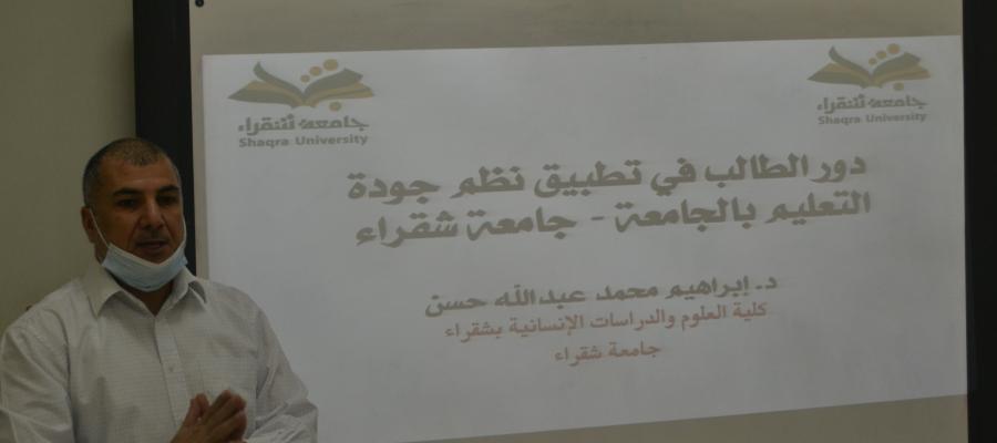 تزامناً مع احتفاليه الكلية بأسبوع الجودة ، نظمت وحدة التطوير و الجودة ندوة طلابية بعنوان "دور الطالب في تطبيق نظم جودة التعليم بالجامعة "  قدمها الدكتور/ إبراهيم محمد عبدالله حسن  تحدث خلالها ان الطالـب يعـد محـور العمليـة التعليميـة، ولـه دور أسـاس فـي تطبيـق نظـم جـودة التعليـم، بـل يمكـن القـول إن مـن الأهـداف المهمـة لتطبيـق الجـودة فـي الجامعـات تحسـين عمليتـي التعلـم والتعليـم، بحيـث تتحقـق مخرجـات التعلـم المسـتهدفة، ممـا ينعكـس بشـكل إيجابـي علـى الطالـب، والجامعـة، والمجتمـع.