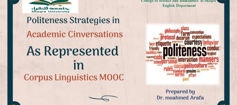 عقد قسم اللغة الإنجليزية بكلية العلوم والدراسات الإنسانية بشقراء ندوته العلمية الثالثة للعام الدراسي هــ ١٤٤٤ عن بُعد و بحضور أعضاء هيئة التدريس حول موضوع  ( Politeness Strategies in Academic Conversations as Represented in Corpus Linguistics MOOC)  وذلك في تمام الساعة1:00  يوم الثلاثاء الموافق 4/10/2022 تفضل مشكوراً بتقديم الندوة سعادة الدكتور/ محمد عرفة هلال وتناولت الندوة الموجهة لأعضاء هيئة التدريسية في القسم مقدمة تضمنت التعريف باستراتيجيات الحوار المهذب والدراسات السابقة والنظريات والمجالات اللغوية التي اهتمت بدراسة الحوار المهذب، ثم قدمت تطبيق عملي للحوار المهذب في المحادثات الأكاديمية من خلال الاستشهاد بالمحادثات التي قدمها قسم اللغة الإنجليزية بجامعة لانكستر بعنوان "المتون اللغوية: منهج وتحليل وترجمة" مع استخدام التحليل الإحصائي للوقوف على استراتيجيات السلوك المهذب الأكثر شيوعا في المحادثات الأكاديمية ،و تكمن أهمية هذه الحلقة العلمية في توضيح أهم عناصر واستراتيجيات الحوار المهذب في المحادثات الأكاديمية  و العمل على التعريف بأهم استراتيجيات الحوار المهذب المستخدمة في المحادثات الأكاديمية بناء على أسس لغوية.