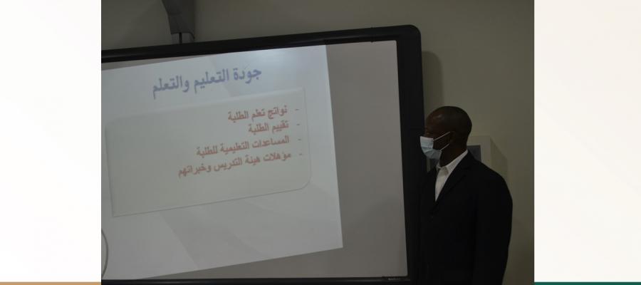 ضمن فعاليات احتفالية الكلية بأسبوع الجودة، وبرعاية سعادة عميد الكلية الدكتور/ عبدالله بن عبدالرحمن الغنايم، أقام قسم إدارة الأعمال بالتعاون مع وحدة الجودة بالكلية محاضرة بعنوان" جودة التعليم والتعلم للطلاب" . قدم المحاضرة الدكتور/عماد عمر أبكر أحمد - أستاذ الاقتصاد القياسي المساعد بالقسم، وذلك يوم الأثنين الموافق 4/4/1443هـ وذلك بحضور 25 طالب. وتناولت المحاضرة شرح لمفهوم التعليم والعلم والفرق بينهما، نواتج تعلم الطلبة، تقييم الطلبة، المساعدات التعليمية للطلبة، ومؤهلات أعضاء هيئة التدريس وخبراتهم.
