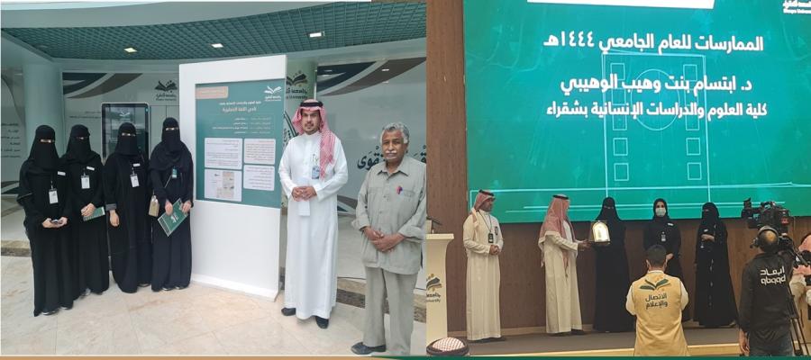 حصدت الكلية اربع جوائز خلال ملتقي يوم الجودة العالمي2022 و الذي نظمته عمادة التطوير و الجودة بالجامعة بحضور سعادة رئيس الجامعة و سعادة وكلاء الجامعة و سعادة العمداء وأعضاء هيئة التدريس و الطلاب وتسلم أعضاء هيئة التدريس الجوائز من سعادة رئيس الجامعة، و كانت الجائزة الاولي لسعادة الدكتورة/ مشاعل منصور السيحاني لأفضل ممارسه للعام الجامعي 1443هـ ( ممارسه معلمتي للعام 1443هـ) و جائزتين لسعادة للدكتورة/ جهاد النيل عبدالله محمد لتقديم دورات بعمادة التطوير و الجودة للعام الماضي 1443هـ و العام الدراسي الحالي 1444 هـ و الجائزة الرابعة لأفضل ممارسة لسعادة الدكتورة / ابتسام وهيب الوهيبي ( نادي اللغة الإنجليزية) و مجال الممارسة عبارة عن نشاط لامنهجي وخدمه مجتمعية و مصادر تعلم.