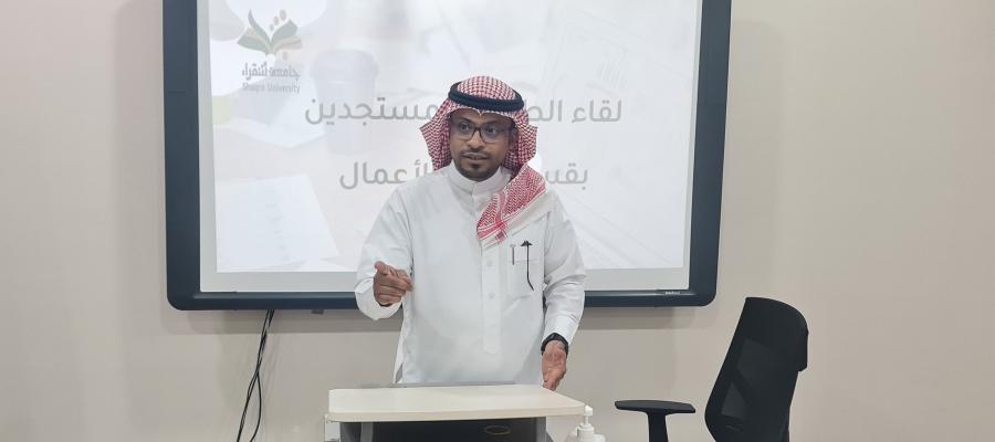 نظم قسم إدارة الاعمال بالكلية لقاء للطلاب المستجدين و كان في استقبالهم سعادة رئيس القسم الدكتور/ محمد المحيميد، و تحدث معهم عن مجالات العمل بعد التخرج و كيفية حساب المعدل التراكمي ودار خلال اللقاء تعريف الطلاب بالإرشاد الاكاديمي بالقسم و أهمية المرشد الاكاديمي للطلاب الجدد، كما شجعهم رئيس القسم على المشاركة في الأنشطة اللاصفية بالقسم و الكلية و الجامعة، وتحدث أيضا بنصح الطلاب باستذكار المحاضرات والاستفادة بالساعات المكتبية المتاحة لجميع الطلاب مع أعضاء هيئة التدريس، و أيضا أوضح للطلاب نظام الاختبارات بالقسم و توزيع الدرجات بالمقررات الخاصة بالقسم.
