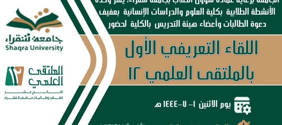بعنوان :( اللقاء التعريفي الأول بالملتقى الثاني عشر)، وذلك يوم الاثنين الموافق 1/7/1444هـ في تمام الساعة الحادية عشر صباحاً تقديم الأستاذة نهى علي محمد