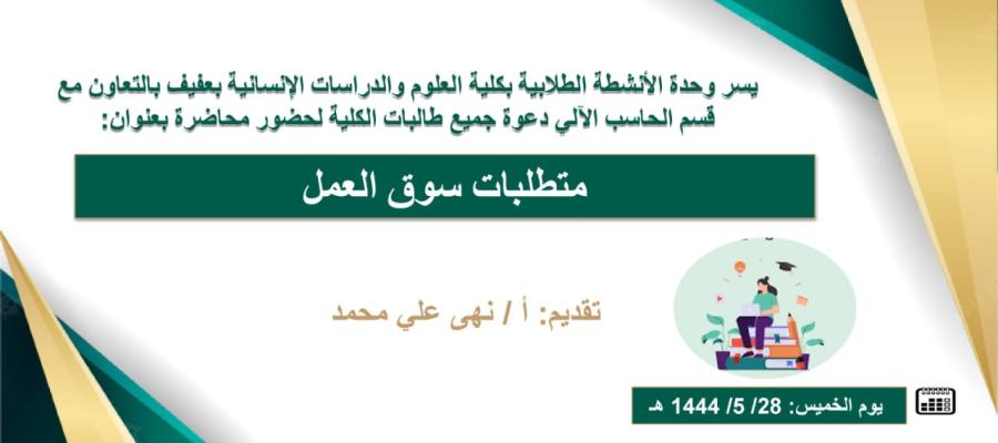 أقامت وحدة الانشطة الطلابية بالتعاون مع قسم الحاسب بكلية العلوم و الدراسات الإنسانية بعفيف-شطر الطالبات برعاية سعادة عميد الكلية د / محمد بن حوال العتيبي و سعادة وكيلة الكلية د/وجود حسين المدني محاضرة بعنوان: متطلبات سوق العمل وذلك يوم الأحد الموافق 01/6/1444هـ بصالة الأنشطة الطلابية في تمام الساعة 12 ظهرا و بحضور طالبات الكلية إعداد و تقديم: أ. نهى علي محمد