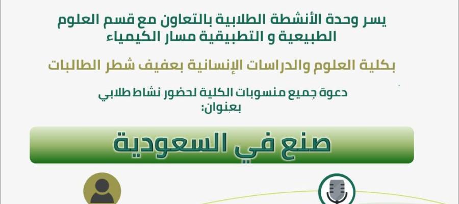 أقامت وحدة الأنشطة الطلابية بالتعاون مع قسم العلوم الطبيعية و التطبيقية /مسار الكيمياء بكلية العلوم و الدراسات الإنسانية بعفيف- شطر الطالبات برعاية سعادة عميد الكلية د / محمد بن حوال العتيبي و سعادة وكيلة الكلية د/وجود حسين المدني بتفعيل نشاط طلابي بعنوان: صنع في السعودية جاء تعزيزا لدور الجامعة في تعريف الطالبات بالبرنامج الوطني (صنع في السعودية ) وتحقيق أهداف الأنشطة الطلابية المتعلقة بتعزيز الهوية الوطنية لدى طلبة الجامعة.