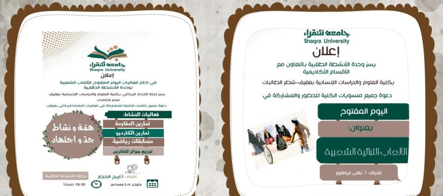 أقامت وحدة الانشطة الطلابية بالتعاون الأقسام الأكاديمية بكلية العلوم والدراسات الإنسانية بعفيف-شطر الطالبات برعاية سعادة عميد الكلية د / محمد بن حوال العتيبي و سعادة وكيلة الكلية د/وجود حسين المدني، يوم مفتوح بعنوان "الألعاب التراثية الشعبية"، إشراف أ. نهى علي ابراهيم  حيث تعكس الألعاب التراثية الشعبية الموروثات الثقافية والتراثية، التي كان يعيشها الآباء والأجداد في الماضي، وتناقلتها الأجيال. وتتنوع الألعاب الشعبية ما بين حركية تعتمد على النشاط البدني وخفة الحركة، وذهنية تعتمد على الذكاء وسرعة البديهة .