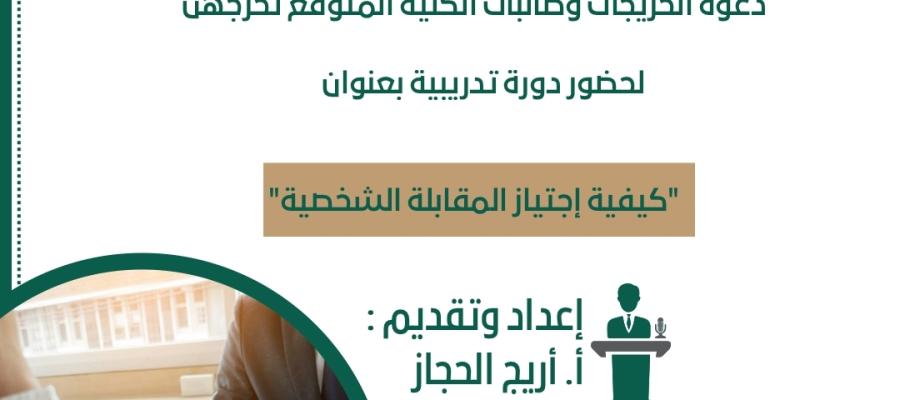 انطلاقاً من أهمية تطوير الذات للطالبة الجامعية، وبرعاية سعادة عميد كلية العلوم والدراسات الإنسانية بعفيف د. محمد بن حوال العتيبي وتوجيهات وإشراف مباشر من سعادة وكيلة الكلية د. وجود المدني، أقامت وحدة الخريجات بكلية العلوم و الدراسات الإنسانية بعفيف- شطر الطالبات دورة تدريبية بعنوان: كيفية احتياز المقابلة الشخصية، وذلك يوم الأحد الموافق8/6/1444هـ , بصالة الأنشطة الطلابية في تمام الساعة التاسعة صباحا, وبحضور طالبات الكلية , إعداد وتقديم أ/أريج الحجاز , تطرقت في البداية الى التعرف على مراحل العمل للحصول على الوظيفة وهي: