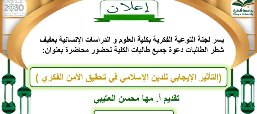 أقامت لجنة التوعية الفكرية بكلية العلوم و الدراسات الإنسانية بعفيف- شطر الطالبات برعاية سعادة عميد الكلية د / محمد بن حوال العتيبي و سعادة وكيلة الكلية د/وجود حسين المدني محاضرة بعنوان :(التأثير الإيجابي للدين الإسلامي في تحقيق الأمن الفكري )، وذلك يوم الأحد 8/6/1444, بصالة الأنشطة الطلابية في تمام الساعة التاسعة والنصف صباحا, وبحضور طالبات الكلية , إعداد وتقديم أ. مها محسن العتيبي حيث تطرقت الى التعرف على مفهوم الامن الفكري حيث يعد بمثابة الرأس من الجسد لما له من الصلة الوثيقة لهوية الأمة وشخصيتها الحضارية حيث لا غنى لها عنه، ولا قيمة للحياة بدونه .