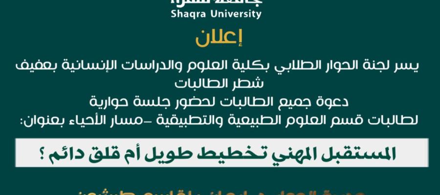 أقام قسم العلوم الطبيعية والتطبيقية مسار الأحياء بالتعاون مع وحدة الأنشطة الطلابية برعاية سعادة عميد الكلية د  / محمد بن حوال العتيبي و سعادة وكيلة الكلية د/وجود حسين المدني جلسة حوارية بعنوان المستقبل المهني تخطيط طويل أم قلق دائم، وذلك يوم الثلاثاء  3/6/1444 ھ - الساعة 9 ونصف, بمسرح الكلية في تمام الساعة التاسعة والنصف  صباحا, وبحضور طالبات الكلية ,  إعداد الطالبات : لينا عبدالله العتيبي / شادن نائف المطيري /شروق ضيف الله العتيبي / نوف محياء العتيبي