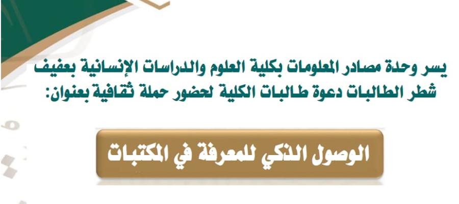 اقامت وحدة مصادر المعلومات بكلية العلوم والدراسات الإنسانية –شطر الطالبات.بعفيف. برعاية سعادة عميد الكلية د. محمد بن حوال العتيبي . وسعادة وكيلة الكلية د. وجود حسين المدني .حملة ثقافية بعنوان: الوصول الذكي للمعرفة في المكتبات.وذلك في يوم الخميس 14/10/1444,بصالة الأنشطة الطلابية في تمام الساعة 12:30 وبحضور طالبات الكلية وتم تقديم النشاط من قبل الطالبات.باشراف أ.خديجة إبراهيم مصطفي.